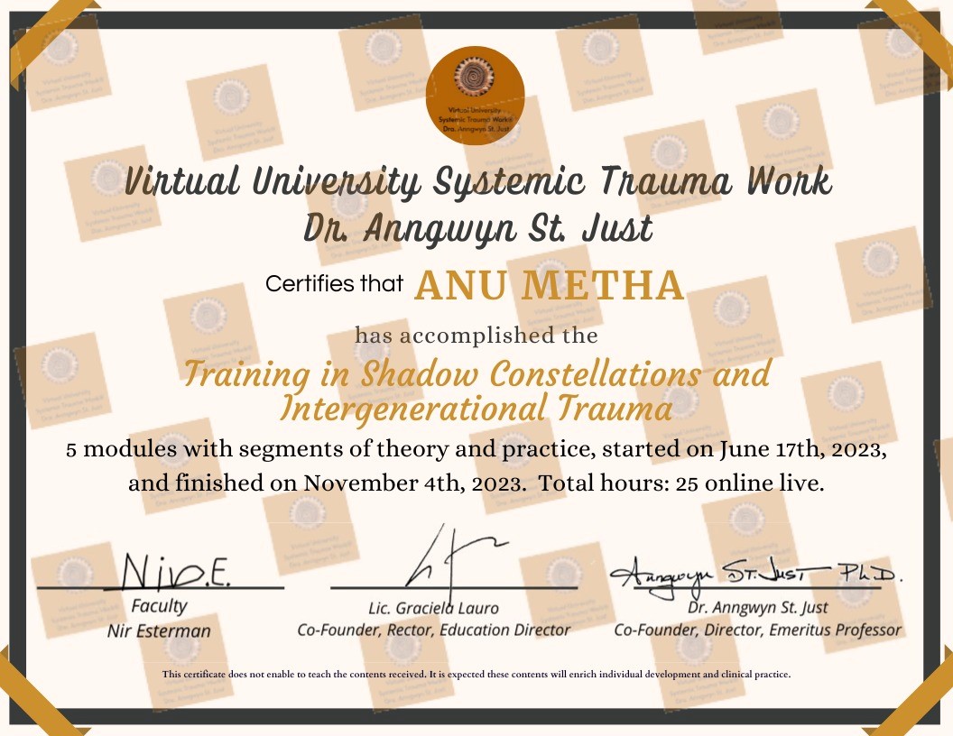 Dr. Anu Mehta is India’s first International Trainer in META-Health, EFT, Matrix Reimprinting, and Advanced Clearing Energetics. With over 20 years of experience in healing, she has empowered countless individuals worldwide in achieving emotional and physical transformation.