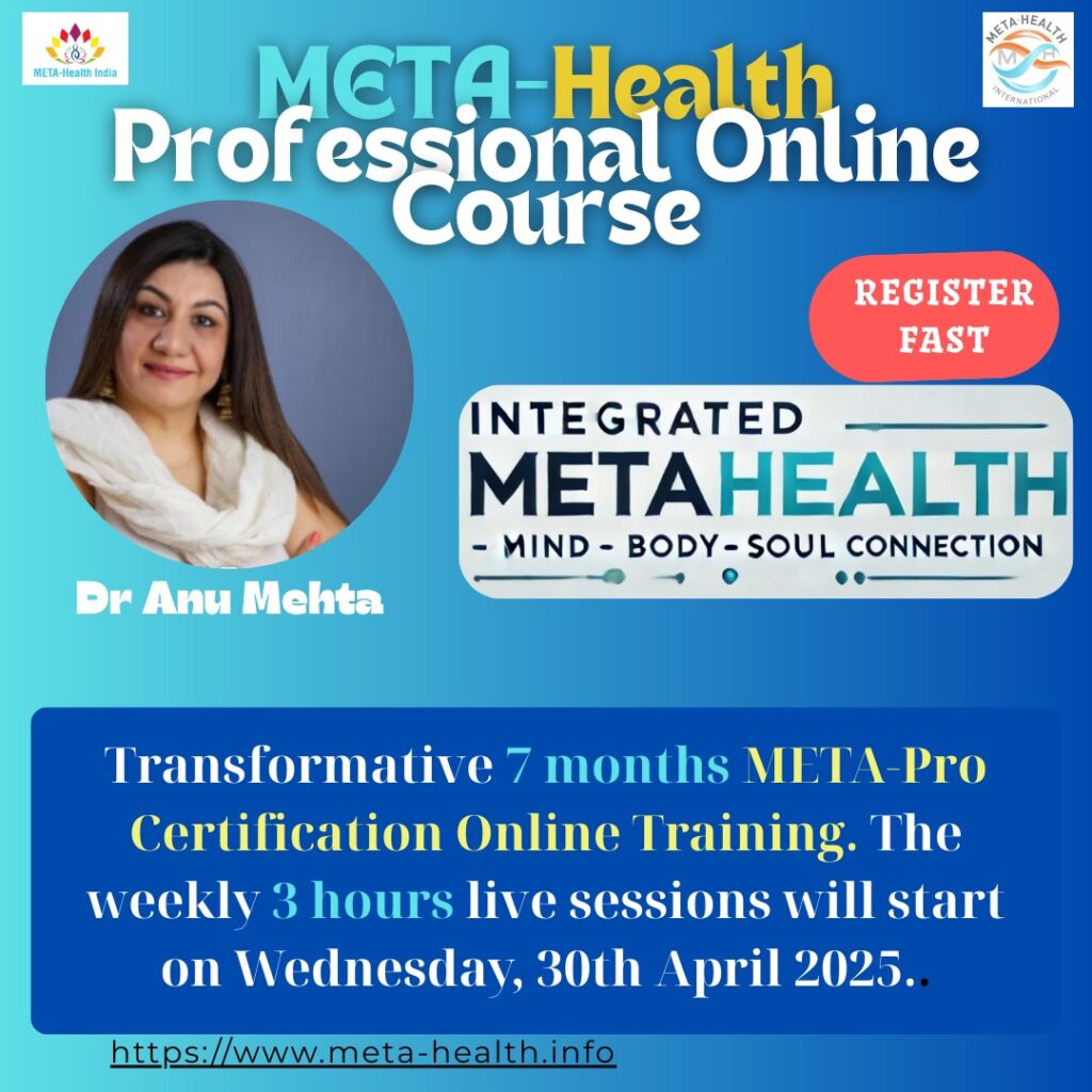 Join Dr. Anu Mehta, a distinguished META-Health Master Trainer (META-Health International Board Member, India; Licensed META-Health Master Trainer; EFT & Matrix Reimprinting Master Trainer) for a transformative META-Pro journey starting 30th April 2025.
